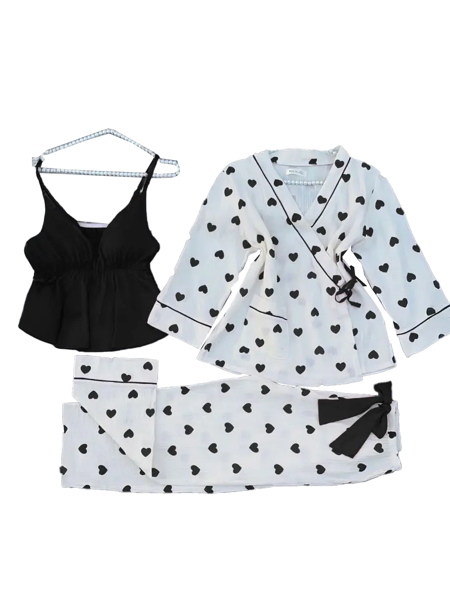 استمتعي بأناقتك حتى في أوقات الراحة مع طقم البيجاما الفاخر من متجرنا طقم مكون من ثلاث قطع أنيقة بتصميم عصري وجذاب، يتميز بنقشة قلوب ناعمة تمنحك إطلالة مفعمة بالأنوثة والرقة يشمل روب بأكمام طويلة وبنطلون مريح بربطة أنيقة على الخصر، بالإضافة إلى توب أسود ناعم بتفصيل بسيط وراقي خامة ناعمة وخفيفة تمنحك شعوراً بالراحة والنعومة طوال الليل لإطلالة مريحة ومميزة في البيت… اختاري من هدوم بنات