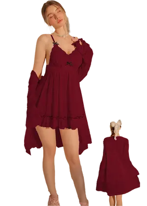- الروب بييجي بنفس الخامة الخفيفة، تصميمه بسيط لكنه مكمل قوي للطقم، سهل اللبس والفك، ومناسب لو حابة تضيفي طبقة خفيفة من الأناقة، الروب بيدي حرية في الاستخدام، ممكن يتلبس فوق القميص في أي وقت، أو يتشال بسهولة حسب المزاج، وده اللي بيخلي الطقم عملي ومتنوع في نفس الوقت