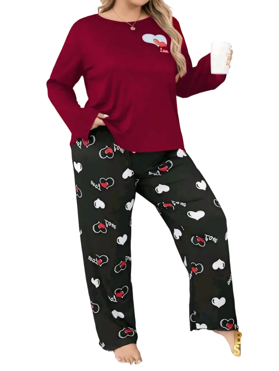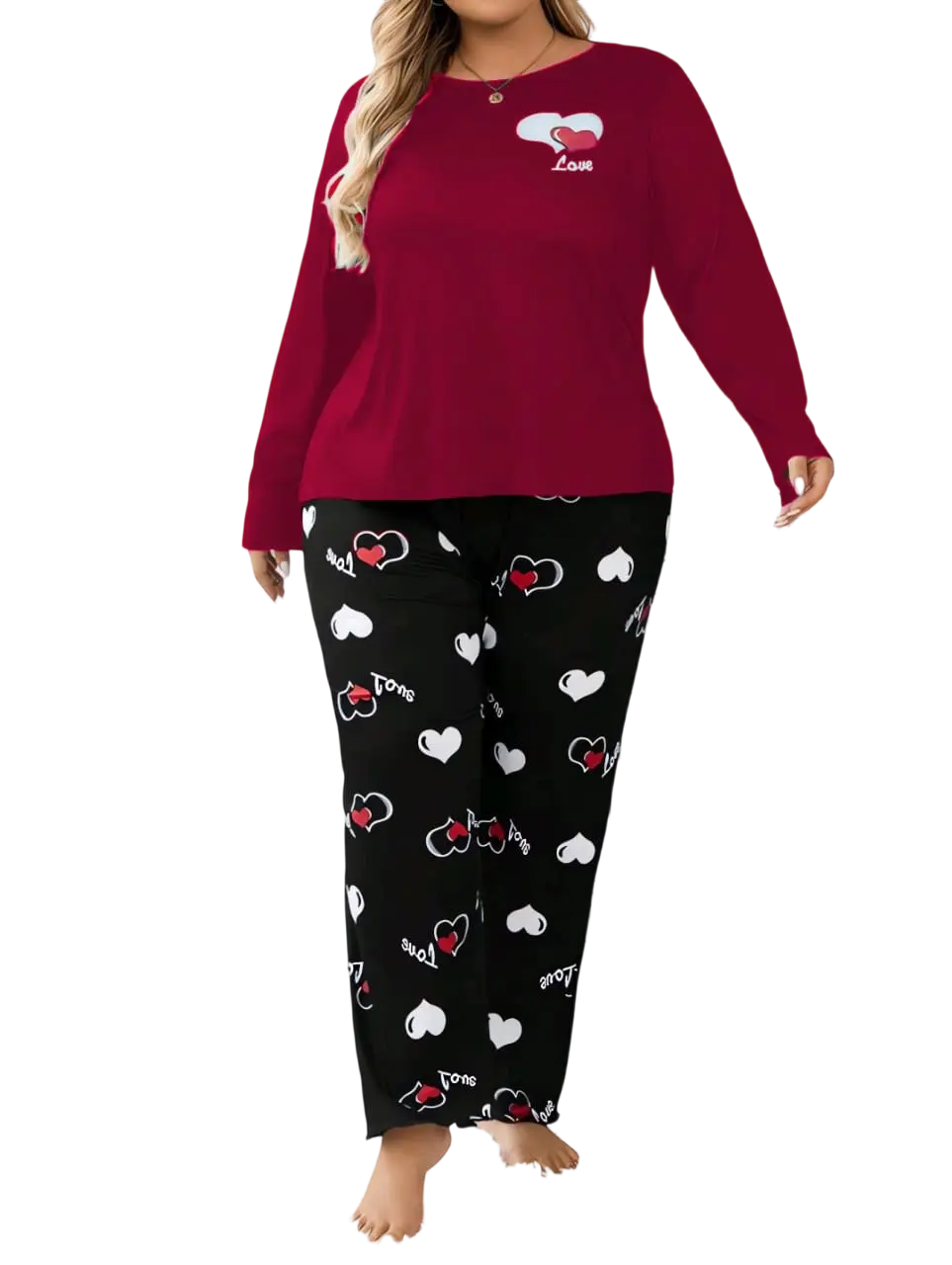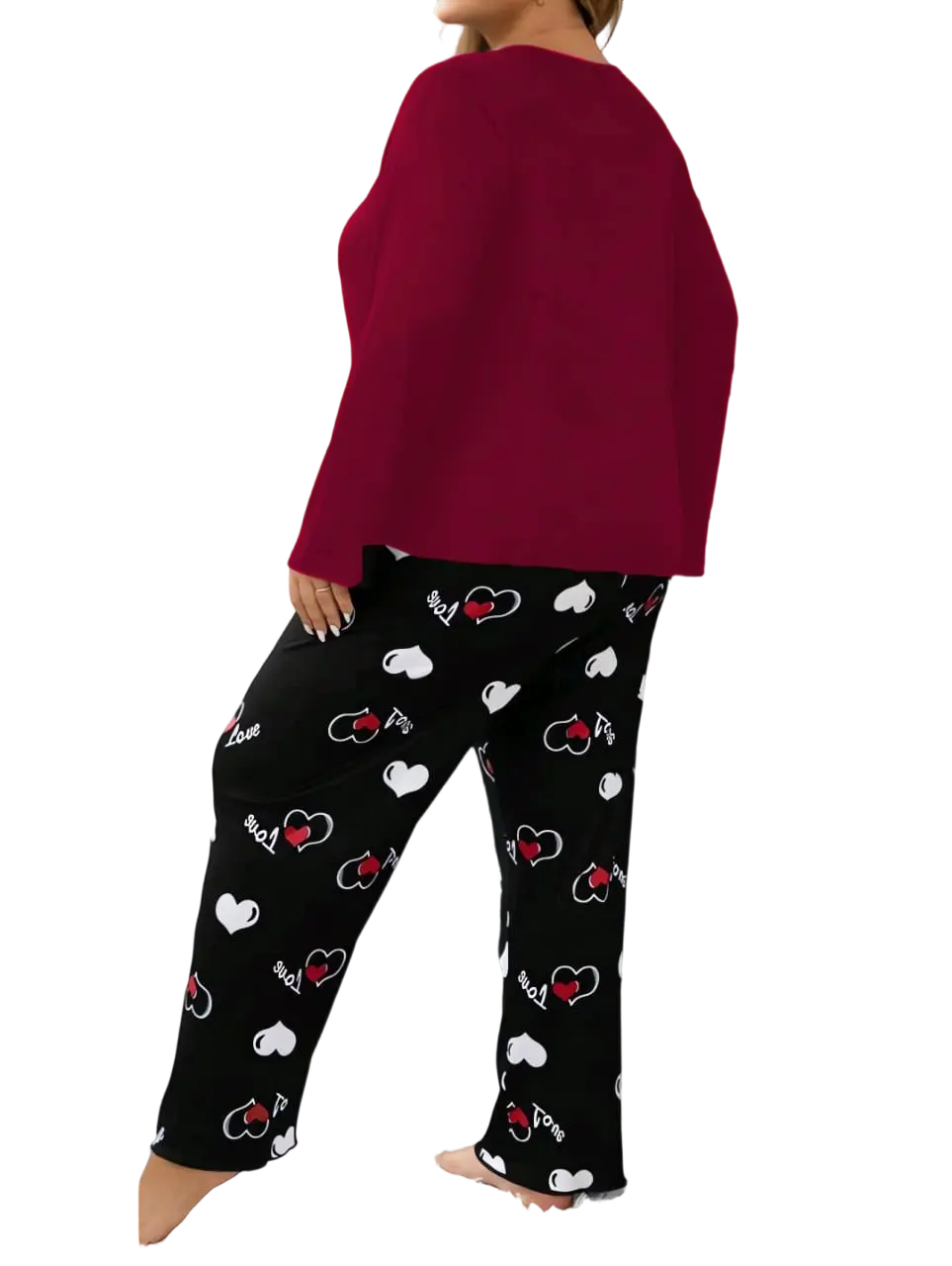جددي دولاب ملابسك مع طقم البيجامة الأساسي في خزانتك المصنوع من خامة القطن ليكرا  الناعمة لضمان الراحة والأناقة طوال اليوم. مع قصة مريحة مثالية للارتداء اليومي. يتميز التيشيرت بلون الاسود بنمط السادة وله رسمة قلب اعلي الصدر بأكمام طويلة واسعة وفتحة رقبة دائرية أما البنطلون منقوش برسومات القلوب بلون الابيض والأحمر وخلفية البنطلون بلون الاسود يناسب الأوزان الصغيرة تبدأ من وزن 90 كيلو وإلي 120 كيلو احصلي علي مظهر عصري ومتجدد