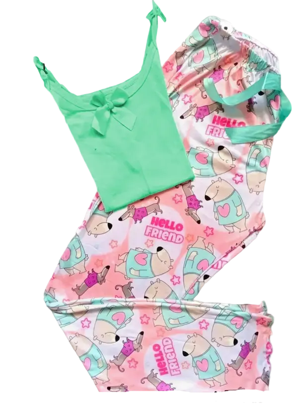 طقم بيجامة بناتي فا الراحة والأناقة تبدأ من البيت نقدم لك هذا الطقم البناتي الرائع المصمم بعناية ليجمع بين النعومة الألوان الحيوية والتفاصيل المحببة لكل فتاة مكونة توب كت أنيق باللون الأخضر الزاهي مصنوع من قماش ناعم ومريح يناسب البشرة الحساسة يتميز بفيونكة أمامية تضيف لمسة أنثوية جميلة مع رباطات على الكتف لتناسب مختلف الأذواق بنطلون طويل بتصميم مطبوع برسومات كرتونية مرحة لحيوانات لطيفة موزعة بشكل جمالي على خلفية وردية بتدرجات ناعمة مما يضفي طابعا طفوليا دافئا ومرحا خامة قطنية عالية الجودة، خفيفة ومريحة على الجسم تصميم مثالي للنوم أو أوقات الاسترخاء بالمنزل