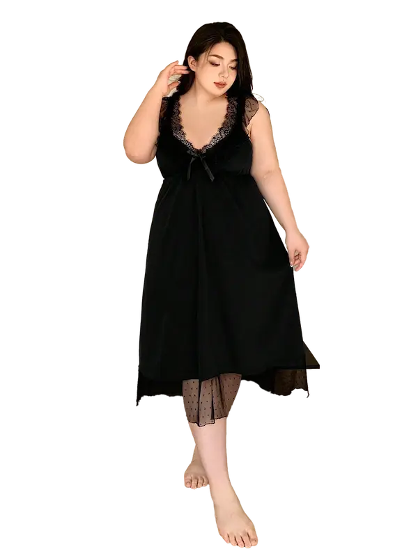 • من الأمام، التصميم مزود بتفاصيل دانتيل ناعمة عند منطقة الصدر تضيف لمسة أنوثة راقية وتبرز الجزء العلوي بشكل جذاب ومتوازن، مع قصة صدر مريحة تناسب المقاسات الكبيرة بدون ضغط. أما من الخلف، فالقصة بسيطة وناعمة، تنساب على الظهر بشكل أنيق بدون أي تعقيد، لتكمل الإحساس بالراحة والعملية.