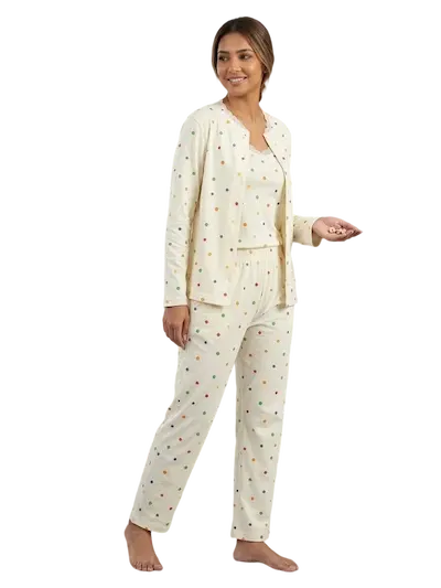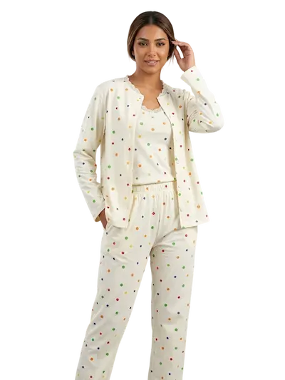 بجامة شيك للعيد 2026 بجاما قطن ناعمة بتصميم أنثوي مميز مناسب للعرايس، الطقم مكون من ثلاث قطع تمنحك إطلالة منزلية أنيقة ومريحة الخامة قطن ليكرا ناعمة على البشرة وتتميز بمرونتها التي تسمح بالحركة بسهولة، كما أن النقشة الملونة الصغيرة تضيف لمسة مرحة وجميلة تجعل الطقم مناسبا للنوم أو للراحة داخل المنزل مع إحساس دائم بالنعومة والراحة.