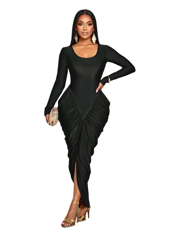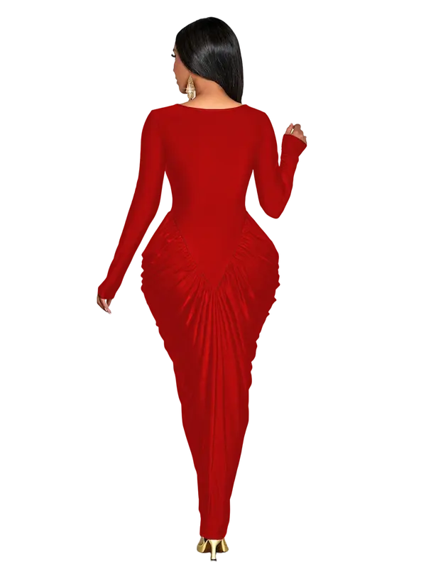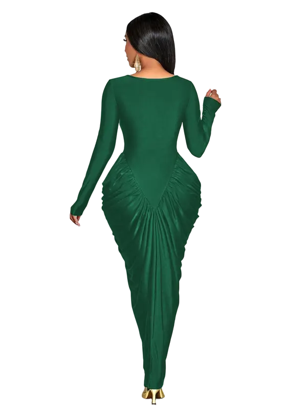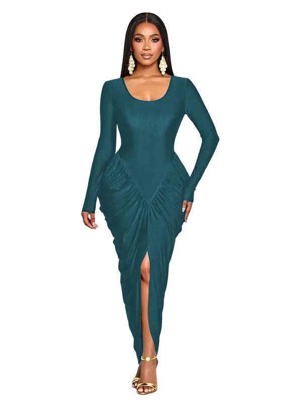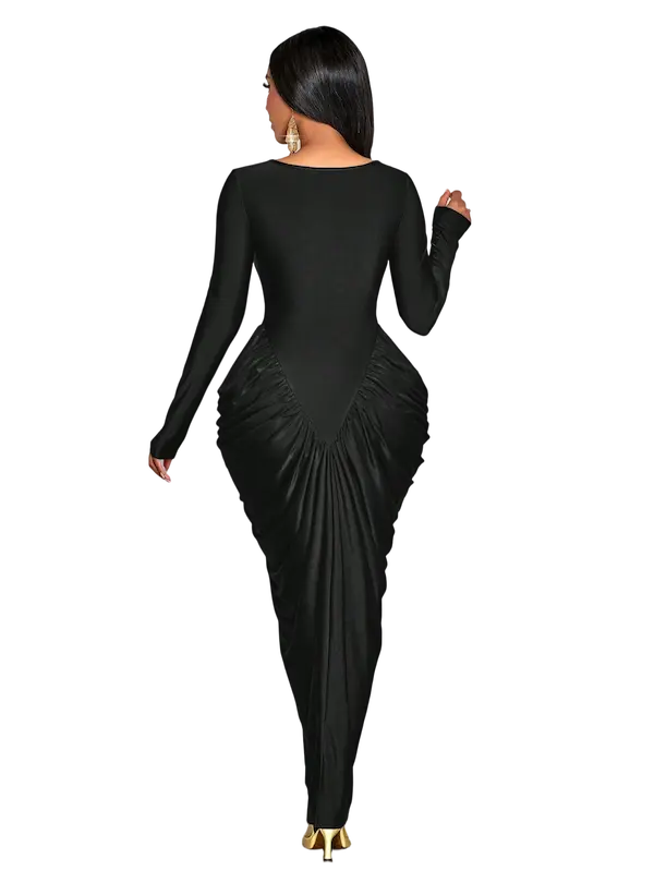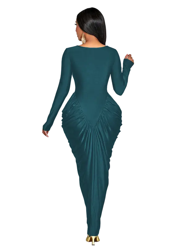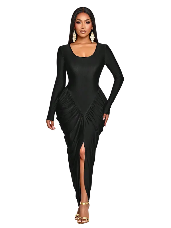 التكسيرات الجانبية الذكية بتدي شكل منحوت للجسم وتبرز الخصر والأرداف بطريقة راقية تخلي شكل الجسم متناسق ومشدود - من الخلف التصميم مكمل بنفس الفخامة والبساطة مع قصة ظهر ناعمة وانسيابية تبرز جمال القوام من غير أي تعقيد