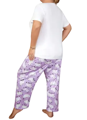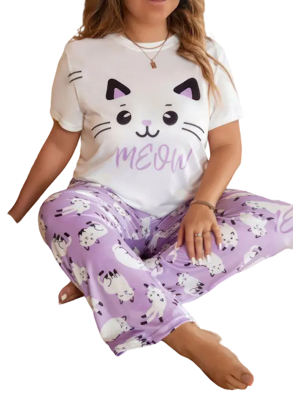 الموديل مكون من قطعتين متناسقتين التيشيرت بلون أبيض ناصع مزين برسمة قطة لطيفة بتفاصيل واضحة وملامح ناعمة مع كلمة MEOW باللون اللافندر المتناسق مع البنطلون الرسمة كبيرة وواضحة في منتصف الصدر تعطي شكل مرح وشبابي وتلفت النظر بشكل جميل.