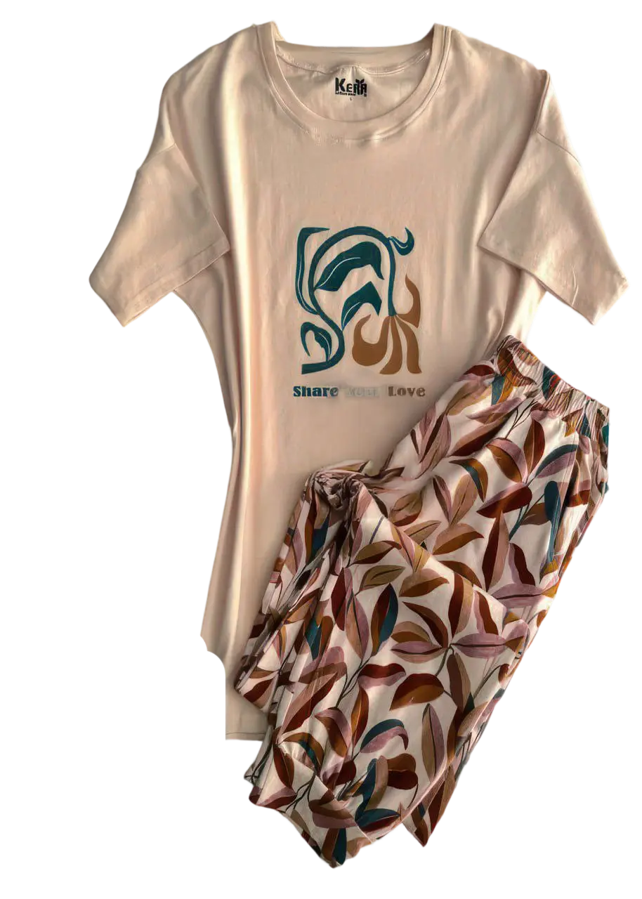 تميزي بإطلالة عصرية ومليئة بالحب مع طقم الجديد من هدوم بنات تيشيرت بيج ناعم بتصميم فني جذاب يضيف لمسة دفء وجمال مع بنطلون مريح بنقشة أوراق ملونة تنبض بالحياة خامة قطنية ناعمة على البشرة تصميم مريح وأنيق مناسب للمنزل أو الإطلالات الكاجوال ألوان متناغمة ومبهجة مستوحاة من الطبيعة كوني فريدة وشاركي حبك بإطلالة تنبض بالأناقة والأنوثة اطلبيه الآن واستمتعي بالراحة كل يوم