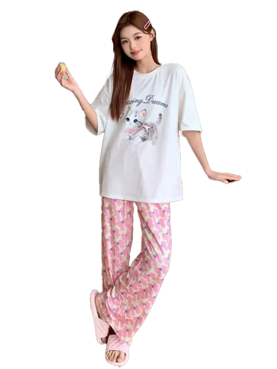 تألقي في منزلك مع طقم البيجامة القطعتين مكونة من توب نص كم بفتحة رقبة دائرية لضمان راحتك ومطبوع كلمات انجلش علي الصدر بلون الاسود مع رسمة قطة والتيشيرت بلون الأبيض النقي مع بنطلون واسع منقوش برسمة فيونكة بلون البينك والأزرق والارضية البنلطون لون الابيض بقصة مريحة لتصبح البيجامة مثالية للاسترخاء بالمنزل أو النوم مصنوعة من خامة قطن ليكرا اسعدي نفسك بكل وقت مع طقم البيجامة