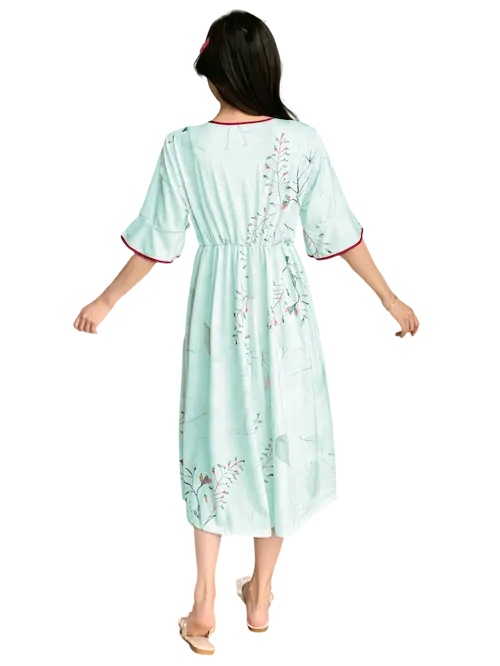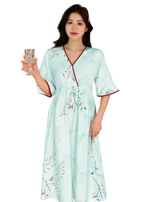 عبايه منزلية أنيقة تجمع بين الراحة والأنوثة الناعمة مصممة بلون بارد هادئ مزين بطبعات ناعمة مستوحاة من الطبيعة تأتي بقصة واسعة ومريحة مع حزام مطاطي خفيف عند الخصر ليمنحك إطلالة أنثوية جذابة دون التنازل عن الراحة التفاصيل الحمراء على أطراف الأكمام وحول الرقبة تضيف لمسة مميزة وأنيقة مثالية لأوقات الاسترخاء في المنزل أو الجلسات الصباحية وتمنحك شعور دائم بالانتعاش والنعومة