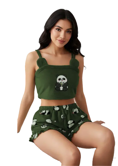 نقدم لكي طقم بيجاما مكون من قطعتين توب حمالات وشورت متناغم بين الراحة والأناقة الخالدة. يأتي بلون الزيتي المطبوع برسمة الباندا تم تصميم هذا الطقم بعناية فائقة، حيث تجمع بسهولة مصنوع من خامة فرو ليكرا مناسب لكي الارتداء اليومي مناسب لوزن من 50 كيلو وحتي 75 كيلو تألقي بإطلالات مريحة وأنيقة سواء كنتِ تسترخين بالمنزل أو أثناء النوم.