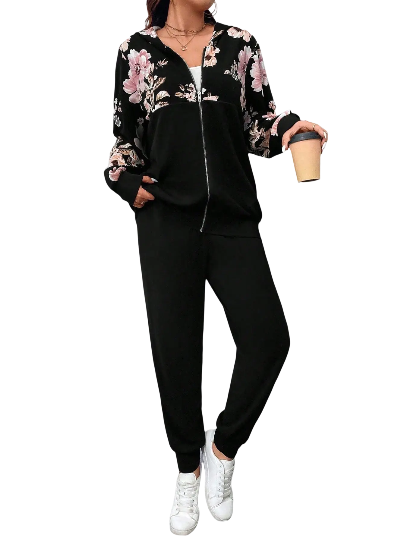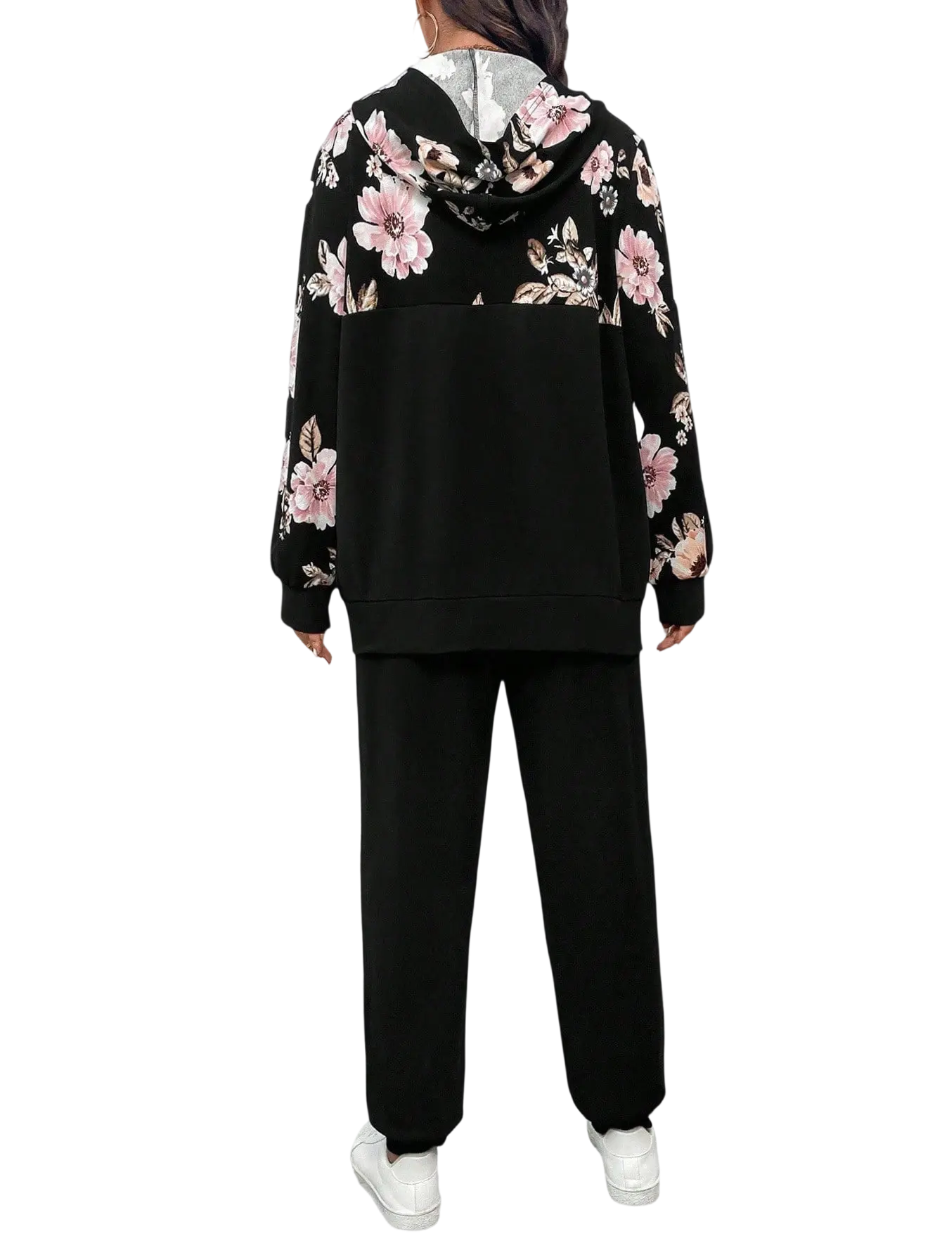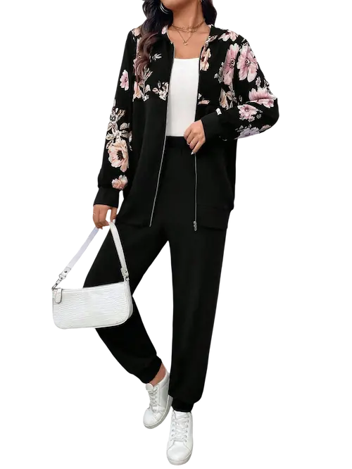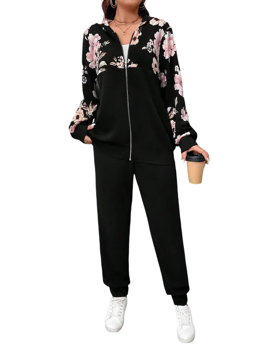 - الجزء العلوي مزين بطبعة ورود كبيرة وأنيقة بتدي لمسة أنثوية راقية على اللون الأسود الهادئ.