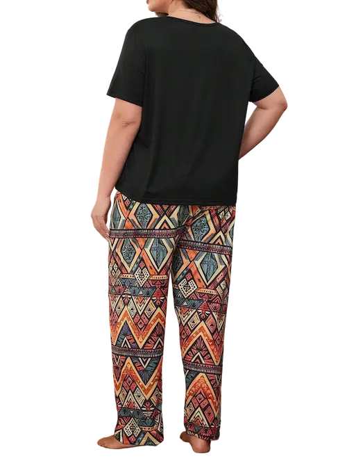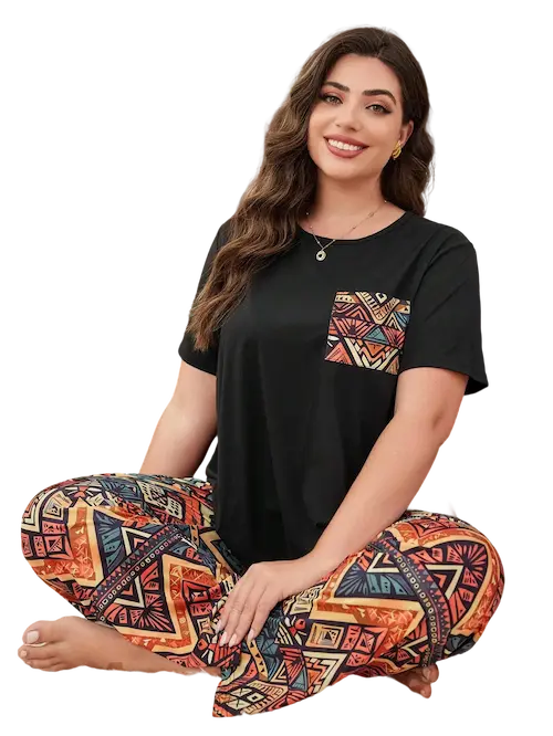 احصلى على لمسة من الأناقة بملابس البيت الخاصة بك مع هذا البيجامة الانيقه المصنوع لاجلك بكل عناية بخامات عالية الجودة لتحتضنك بكل نعومة من اجل راحتك وهي خامة قطن ليكرا بمقاسات من 90 كيلو وإلي 120 كيلو تعطي لمسة من الاناقة والجاذبية في آن واحد مكونة من تيشيرت سادة أكمام قصيرة وبنطلون فضفاض ومريح يأتي بنمط مشجر فهي بيجامة مريحة لوقت استرخائك