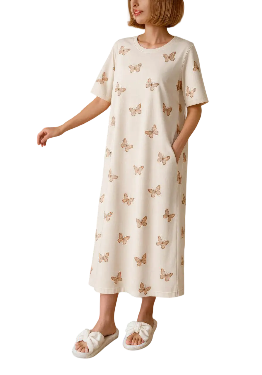 كاش مايوه ناعم من متجرنا يعطي نعومة الفراشات بإطلالة أنثوية ساحرة تصميم بسيط وراقي بلون كريمي مزين بطبعات فراشات تمنحك إحساس بالراحة والجمال في آن واحد خامة قطنية ناعمة ومناسبة للبشرة الحساسة قصة واسعة وأنيقة لحرية الحركة طوال اليوم مثالي للبيت أو المصيف لإطلالة ناعمة وعصرية خلي إطلالتك هادية وجميلة زي الفراشة