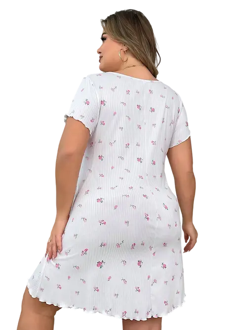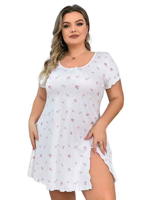 أضيفي لمسة دلع إلى روتينك اليومي فستان نوم ناعم وانسيابي مصمم خصيصا ليبرز أنوثتك بكل بساطة وجمال. مصنوع لمقاسات BIG SIZE ليمنحك الراحة والمرونة دون أن تتخلي عن الجاذبية بلون أبيض نقي مزدان بنقوش ورود صغيرة تمنحك إحساسا بالانتعاش والنعومة قصة قصيرة مع فتحة جانبية جريئة تضيف لمسة من الجرأة بأسلوب أنيق أكمام قصيرة وتشطيب متموج على الأطراف لمظهر أنثوي مثالي قماش خفيف ومريح يرافقك في كل لحظة استرخاء