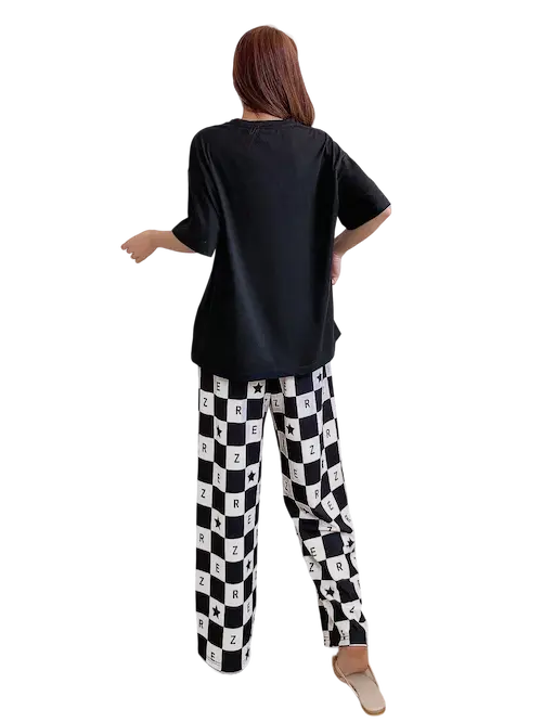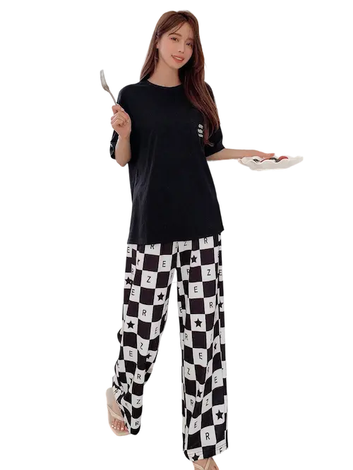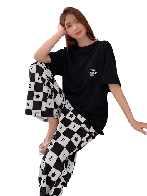 طقم بناتي كاجوال أنيق ومريح مثالي للإطلالات اليومية أو الجلسات المنزلية البلوزة بتصميم بسيط بلون أسود أنيق يضفي لمسة راقية وعصرية بنطلون بتصميم مربعات مميز باللونين الأبيض والأسود مع حروف ونجوم تضيف طابعا شبابيا ملفتا خامة ناعمة ومريحة مناسبة لفصل الصيف تجمع بين الأناقة والراحة احصلي عليه الآن وأبرزي أسلوبك الخاص بكل ثقة