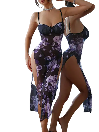 • فستان لانجري طويل (Long Lingerie Slip) مصنوع من قماش Powernet Lycra الشفاف المعروف بمرونته العالية وقدرته على إبراز شكل القوام بانسيابية. يتميز بنقشة زهرية داكنة جذابة، يغلب عليها البنفسجي والأرجواني والأسود، لتعطي إحساسًا دراميًا وغامضًا رائعًا.