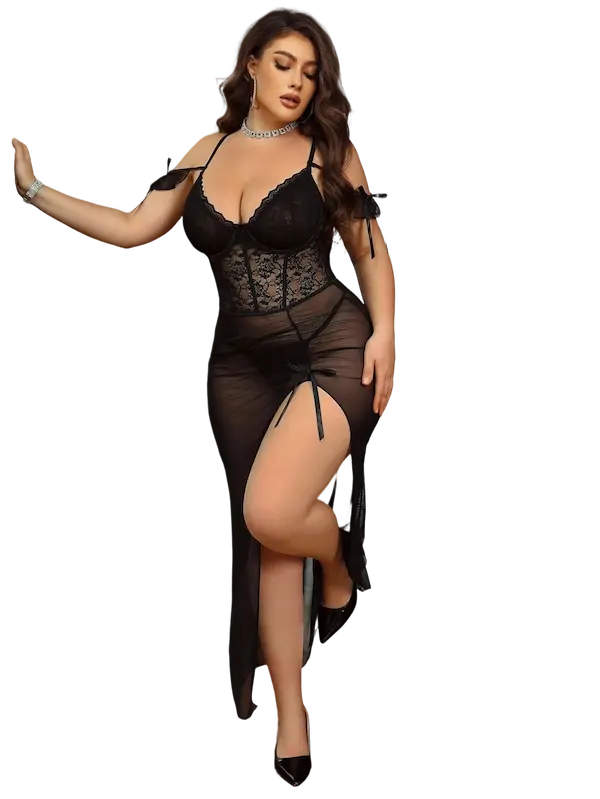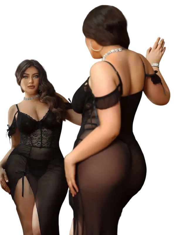 - الحمالات الرفيعة معمولة علشان تثبت القطعة وتدي شكل رقيق على الكتفين، تفاصيل الأكتاف المفتوحة مع الرباط الخفيف بتضيف لمسة دلال وأناقة تخلي التصميم مختلف، الشق الجانبي الطويل بيضيف جرأة محسوبة ويدي حرية حركة وإحساس بالثقة، من الخلف التصميم شفاف بالكامل بانسيابية تبرز جمال الظهر ومنحنيات الجسم.