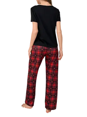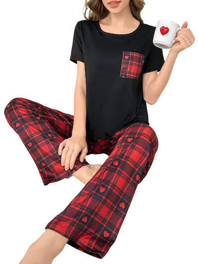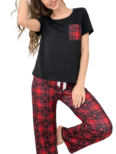 بجامة قطنية واسعة باللون الأسود تصميم عملي بطابع شبابي مميز يجمع بين بساطة التيشيرت الأسود وجاذبية البنطلون الكاروهات الأحمر والأسود المزود بلمسة قلوب صغيرة تضيف روح مرحة وأنثوية