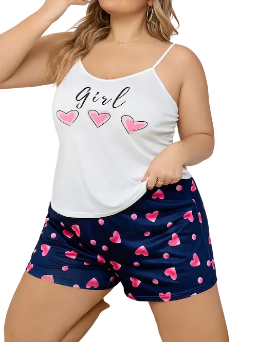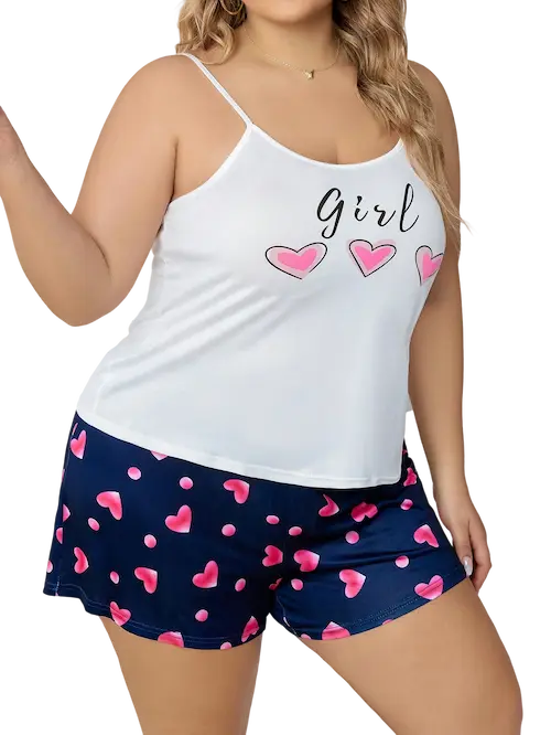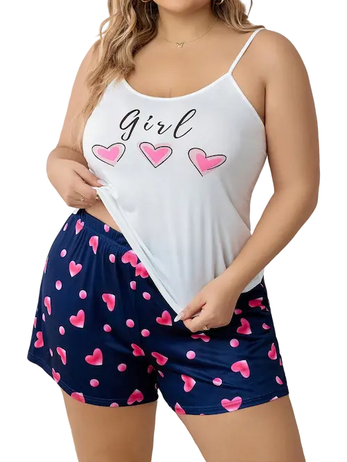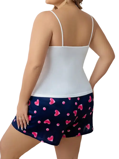 دللي نفسك بأحلى طقم نوم بلس سايز توب بيضاء بكتف رفيع وتصميم بسيط تعكس أنوثتك بنعومة. أما الشورت، فيأتي بلون كحلي مزين بقلوب متناثرة بلون وردي ساحر، يضيف لمسة حيوية ومرحة لطلتك خفيف ومريح مثالي لأجواء الصيف ستايل شبابي ناعم بلمسة أنثوية قصة مريحة للمقاسات الكبيرة قماش ناعم على البشرة يوصل لراحة مطلقة نامي براحة واصحي بجمال! الطقم هذا بيكون رفيقك المثالي كل ليلة.
