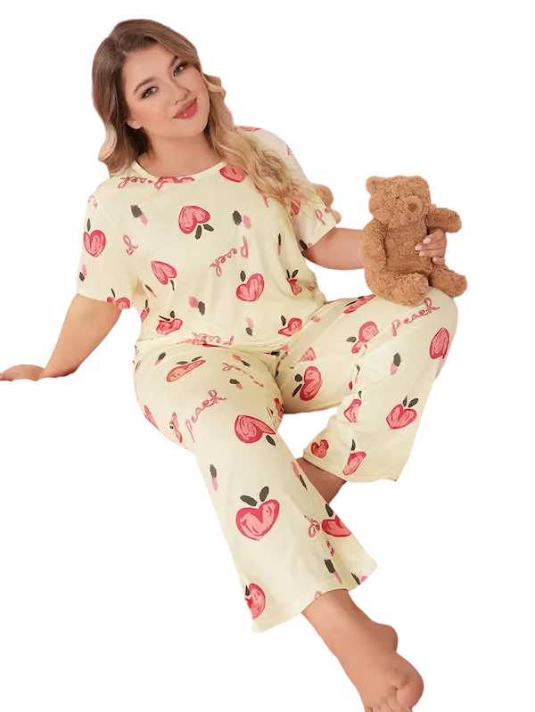 بيجامات عرايس جديدة  استمتعي بأقصى درجات الراحة والأناقة مع بيجامة النسائية المصممة خصيصا مصنوعة من خامة قطن ليكرا ناعمة ومريحة مثالية للنوم أو للاسترخاء في المنزل وتتميز بتصميم لطيف بطبعة الخوخ وكلمات لانجلش الجذابة التي تضيف لمسة مرحة وعصرية تصميم أنثوي عصري بطبعات فاكهية مميزة. قماش ناعم وخفيف يمنحك راحة طوال اليوم. قصة واسعة ومريحة مثالية للمقاسات الكبيرة اجعلي كل ليلة أكثر راحة وأناقة مناسبة لوزن من 90 كيلو وحتي 120 كيلو اطلبية الأن قبل نفاذ الكمية