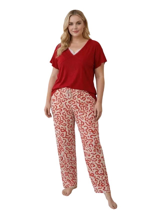 - البنطلون مزين بنقشة عصرية متداخلة باللون الأحمر على خلفية فاتحة ما يضيف شكل مميز وجذاب القصة مستقيمة واسعة تسمح بحرية كاملة أثناء النوم أو الراحة الوسط مزود بمطاط مرن يثبت البنطلون بدون ضغط والطول مناسب ليعطي مظهر مرتب على القدم.