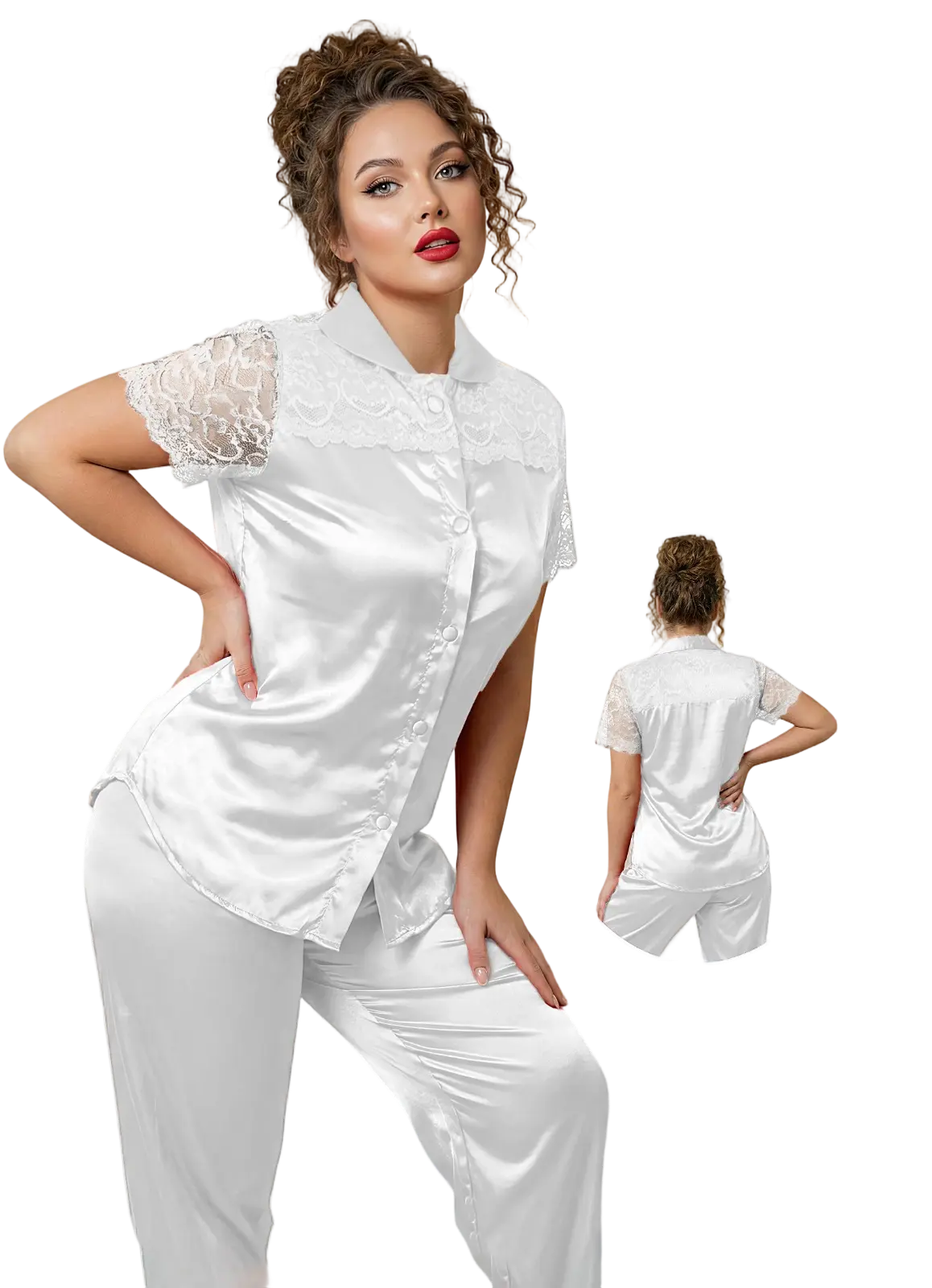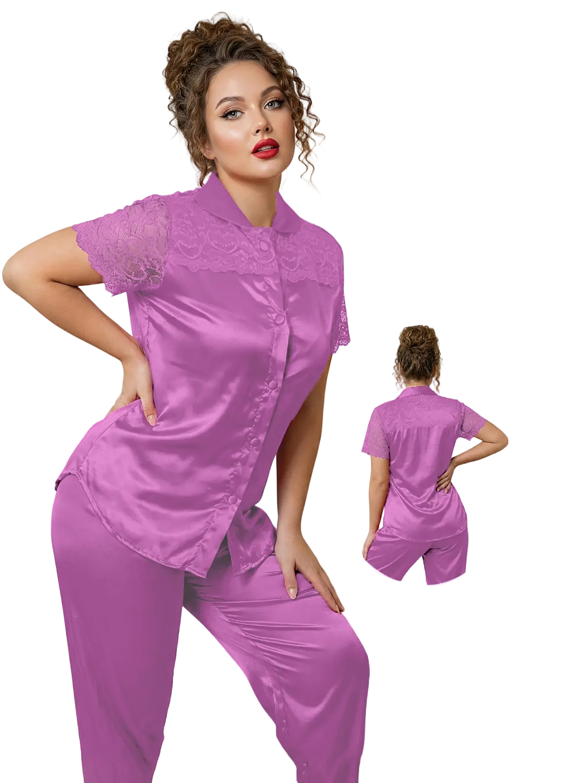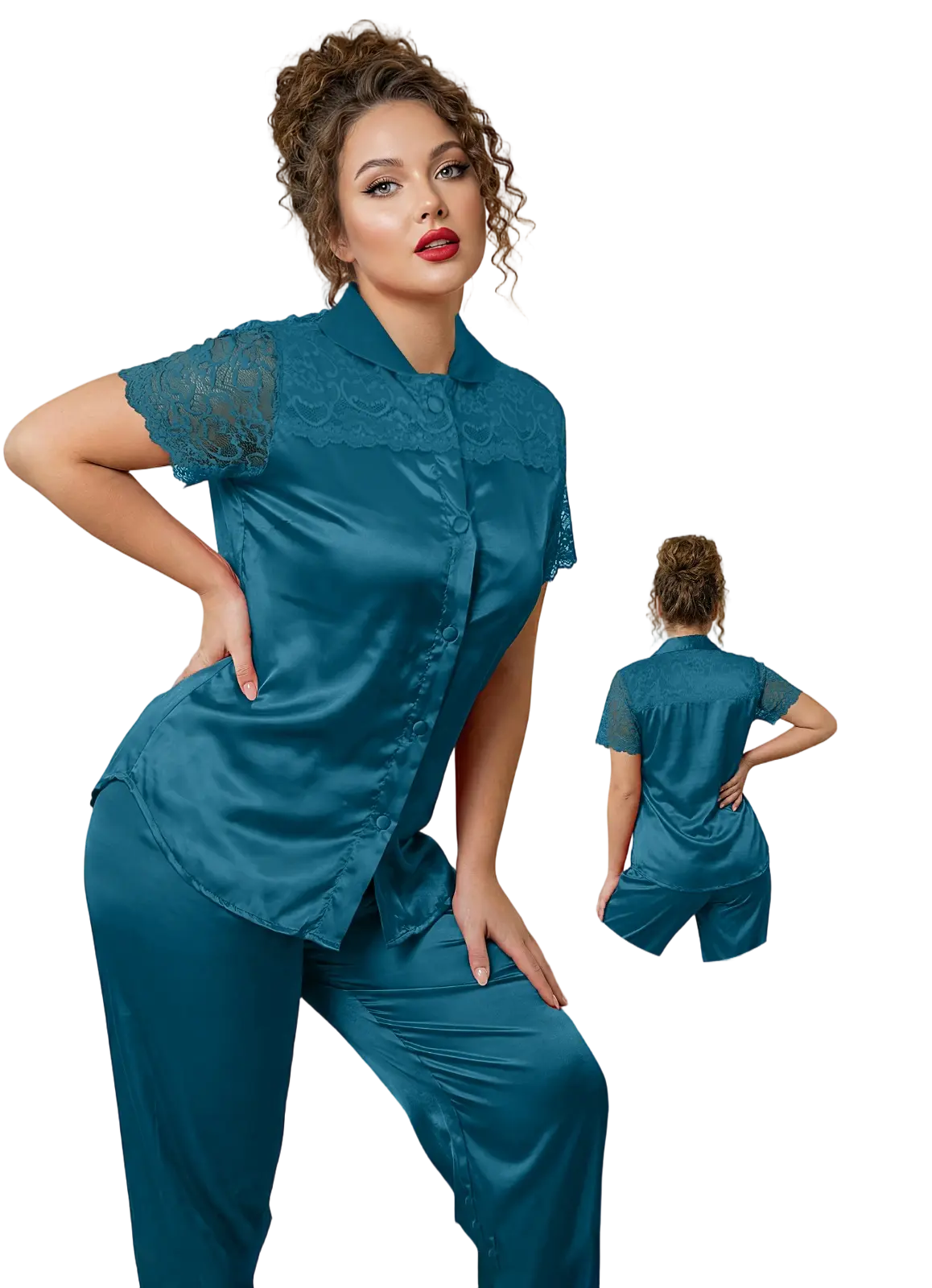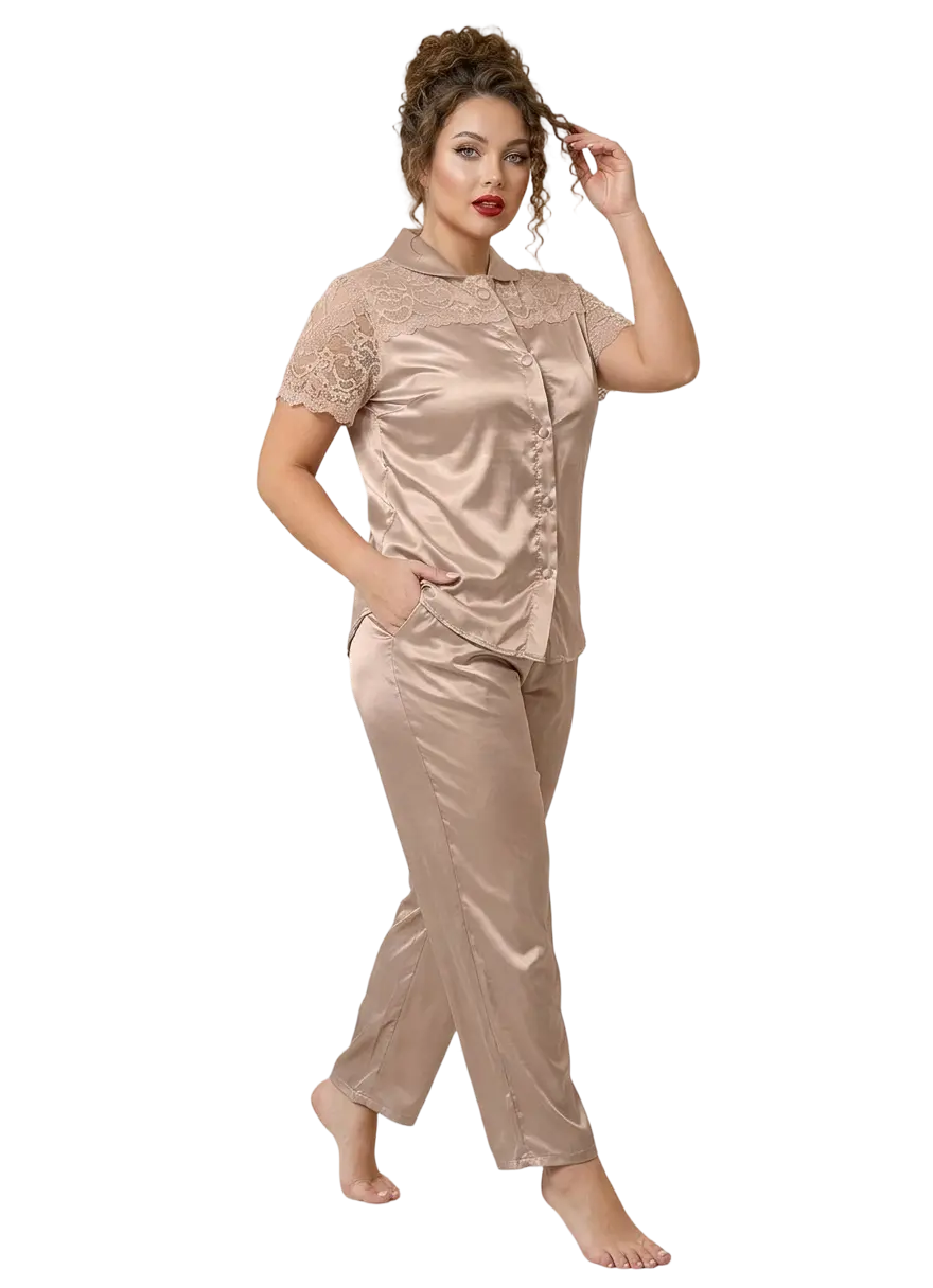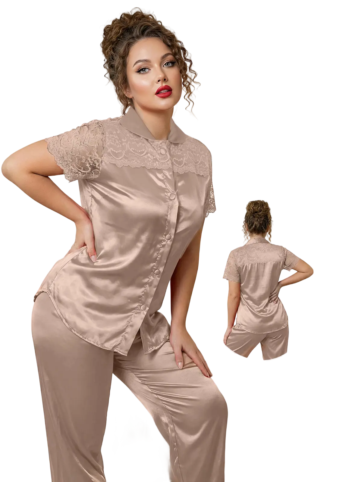 بجاما جديدة ستان للعيد بتفاصيل دانتيل راقية الطقم مصنوع من خامة ستان ناعمة عالية الجودة بملمس حريري وانسيابي على الجسم الستان يتميز بلمعته الهادية الراقية اللي تعكس فخامة وأناقة بدون مبالغة، وفي نفس الوقت خفيف ومريح على البشرة، ما يسببش إحساس بالحر أو الضيق الخامة عملية وسهلة العناية، وتحافظ على شكلها ولمعتها مع الاستخدام المتكرر قميص بأزرار أمامية كاملة لسهولة اللبس والخلع ياقة كلاسيك تضيف لمسة رسمية أنيقة أكمام قصيرة مزينة بتفاصيل دانتيل ناعم راقي تضيف أنوثة مميزة ولمسة فخامة واضحة. قصة مستقيمة مريحة تنسدل بنعومة على الجسم بدون ما تكون ضيقة أو واسعة بزيادة بنطلون بقصة مستقيمة يمنح مظهر متوازن وأنيق، مع خصر مريح يسمح بحرية الحركة التصميم يجمع بين الطابع الكلاسيكي والرقي العصري، عشان يديكي شكل شيك حتى في البيت الطقم ده مش مجرد بيجاما ده إحساس بالفخامة والدلع اليومي اختيار مثالي لكل سيدة بتحب تحافظ على أناقتها حتى في أبسط تفاصيل يومها.