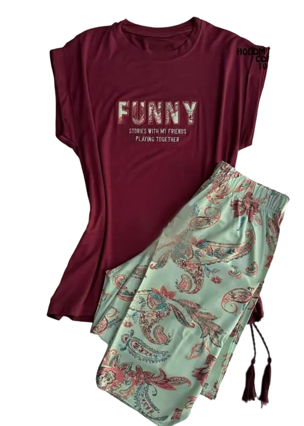 استمتعي بالأناقة والراحة في آن واحد مع طقم النوم الراقي تيشيرت بلون خمري أنيق مطبوع بعبارة FUNNY بتفاصيل عصرية مع بنطون واسع بنقشة زهور وبايسلي مفعمة بالألوان لإطلالة مريحة وناعمة الخامة الانسيابية تمنحك إحساسا فائق النعومة والمقاس المريح يجعل هذا الطقم خيارك الأمثل للاسترخاء أو قضاء وقت ممتع بالمنزل خامة قماش ناعم وانسيابي تصميم دمج أنيق بين الطابع العصري والنقشات الكلاسيكية مقاس مثالي لمختلف الأجسام ويوفر راحة قصوى لأنك تستحقين أن تنامي بأناقة كل ليلة