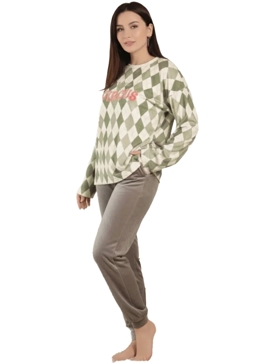 احصلي علي إطلالة من الرقي والراحة في آن واحد مع طقم البيجامة المكون من تيشيرت بأكمام طويلة ورقبة دائرية منقوش برسومات من المربعات اما عن البنطلون فهو بنمط سادة ومزود بوسط مطاطي مريح لارتداء لفترات طويلة يناسب لذوات الأوزان الصغيرة من 50 كيلو وإلي 75 كيلو اسعدي نفسك بكل وقت في منزلك
