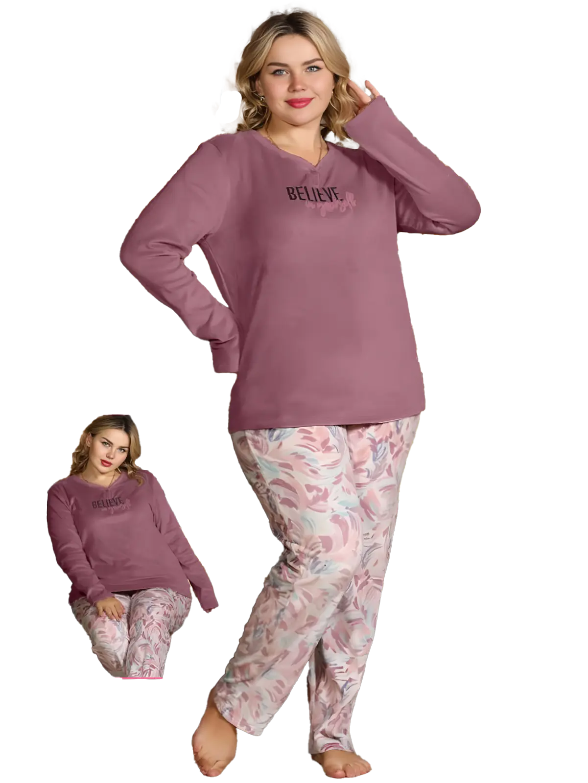 البيجاما مصممة بعناية لتمنحك تجربة راحة فاخرة وأناقة منزلية مميزة تتكون من بلوزة قطيفة ناعمة بلون موف راق مزين بعبارة أنثوية “Believe in yourself” تعكس الإيجابية والثقة بالنفس، مع ينطلون منقوش بنقوش وردية هادئة تضيف لمسة من الحيوية والرقي خامة القطيفة المستخدمة تمتاز بملمسها المخملي الفاخر الذي يمنح إحساسا دافئا وناعما على البشرة، مما يجعلها مثالية لفصل الشتاء يمكن ارتداء هذه البيجاما في أوقات الاسترخاء بالمنزل أو قبل النوم، كما تناسب الجلسات المسائية أو أيام العطلة بفضل تصميمها الأنيق الذي يجمع بين الراحة والمظهر المرتب اختيارك المثالي لقضاء أوقاتك في دفء وأناقة لإطلالة منزلية متكاملة.
