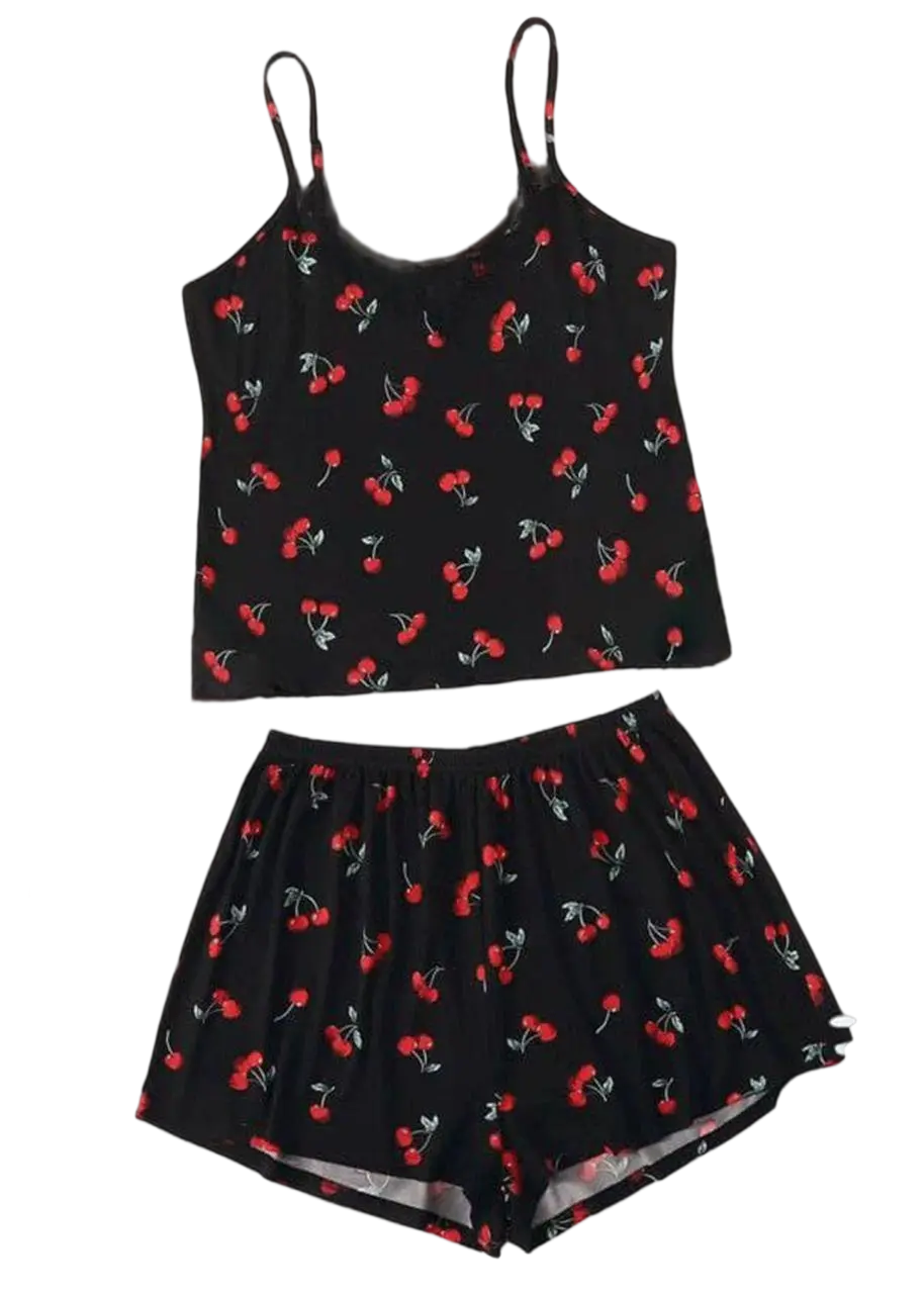 استمتعي بالراحة والأنوثة مع طقم بيجامة قطعتين باللون الأسود المزين برسومات الكرز الحمراء الجذابة الخامة ناعمة وخفيفة لتمنحك إحساس مميز بالراحة طوال اليوم والليل مع تصميم كاجوال عصري يناسبك في البيت أو وقت الاسترخاء متوفرة لتناسب جميع المقاسات وتظهر أنوثتك بأجمل إطلالة اختيارك المثالي للراحة والأناقة في آن واحد