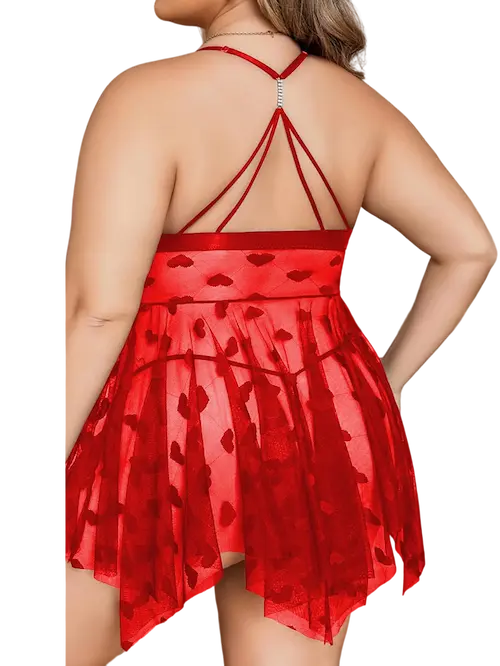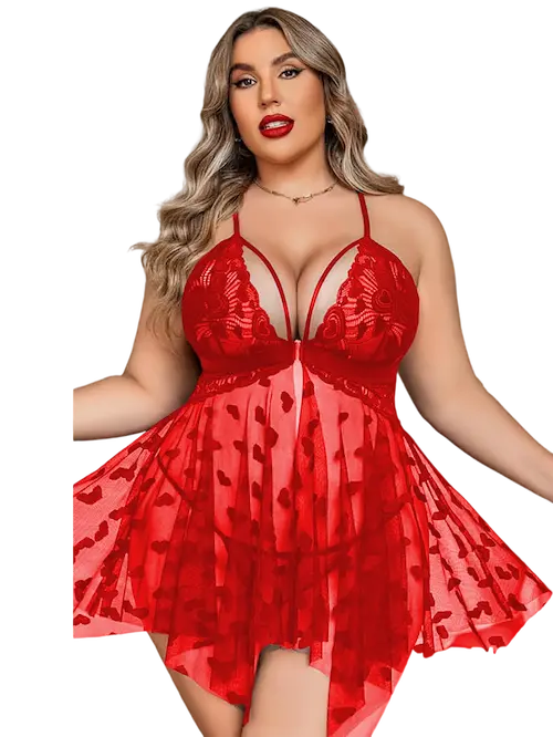 قميص نوم أنثوي أنيق بلون أسود ساحر، يتميز بتصميم جريء وراقي يناسب المقاسات الكبيرة. الجزء العلوي مصنوع من دانتيل فاخر برسومات جذابة تعزز من أنوثتك، بينما يأتي الجزء السفلي بتول شفاف مزين بنقوش قلوب ناعمة تضيف لمسة رومانسية ودلال. يتميز القميص بقصة قصيرة مع أشرطة رفيعة متقاطعة من الخلف تمنحك إطلالة مثيرة ومريحة في نفس الوقت. خيار مثالي للمرأة التي تبحث عن الأناقة والثقة والجاذبية في آنٍ واحد