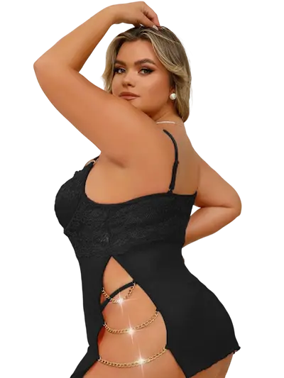 بيبى دول بيج سايز قصير وشيك جدا يتميز بشكله المختلف مكشوف الصدر و مزين أعلي منطقه الصدر بالدانتيل نفس لون القميص فهو باللون الاسود لا غني عنه في خزانتك *  و الأحمر لون الحب وليالي الخاصة اذا ست بيت حبه تجددي واذا عروسة بتجهزي سيناسبك مصنوع من خامة زبده ليكرا تتناغم مع دانتيل مزود بفاتحة جانبيه ومعه سلاسيل باللون الذهبي ليظهر مفاتنك وتكوني بشكل مثير وجذاب اطلبيه الأن اذا وزنك من 80 كيلو وحتي 110 كيلو.