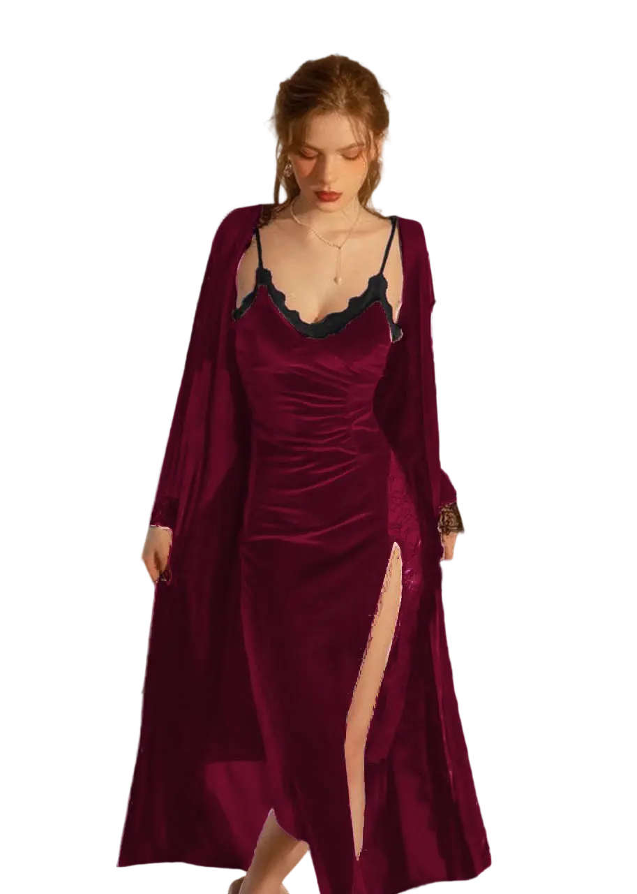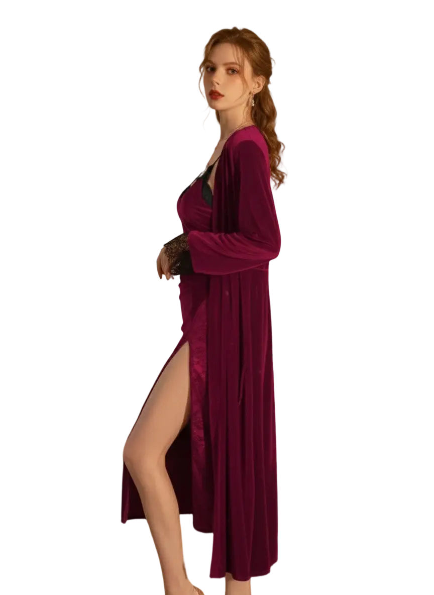 طقم روب للمتزوجات مصنوع من خامة قطيفة ليكرا خامة تمتاز بالدفء والراحة عند ارتداؤها فهو موديل يتعدد استخدامة يناسبك اثناء النوم وأوقاتك الخاصة يأتي بألوانه جمالية منها النبيتي * كاشمير * أزرق * بترولي * بينك* موف * اسود*  فما هو لونك المفضل الذي يناسب ذوقك صنع بتصميم غاية في الدقة و التميز،القميص مزين بالدانتيل علي الصدر ومزود بفتحه من الجنب والروب مزين بدانتيل من علي الكم يضيف التميز لإطلالتك مناسب لوزن من 50 كيلو وحتي 75 كيلو أكلبة الأن قبل نفاذ الكمية