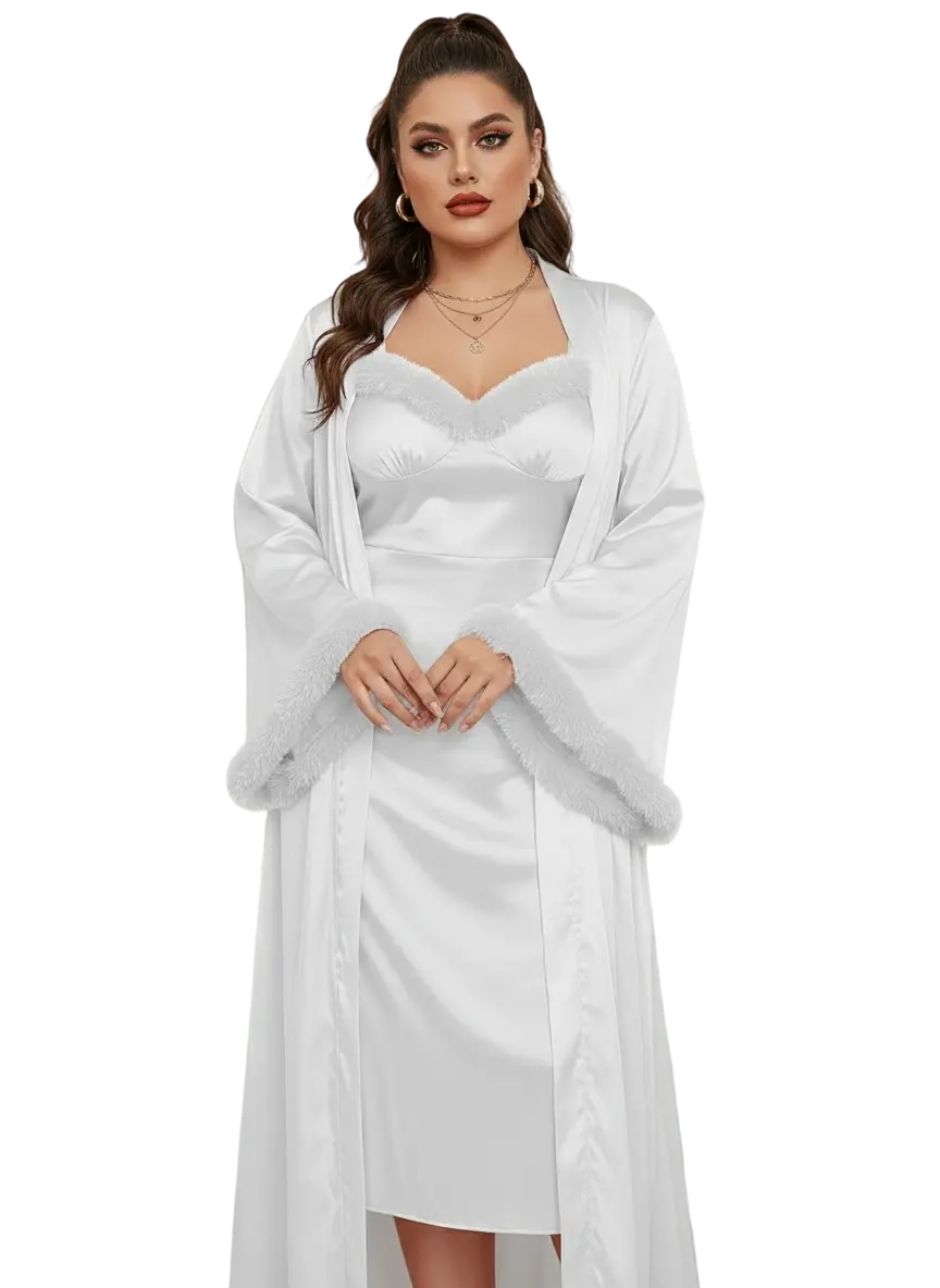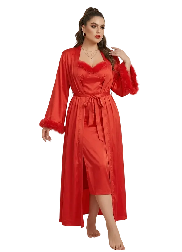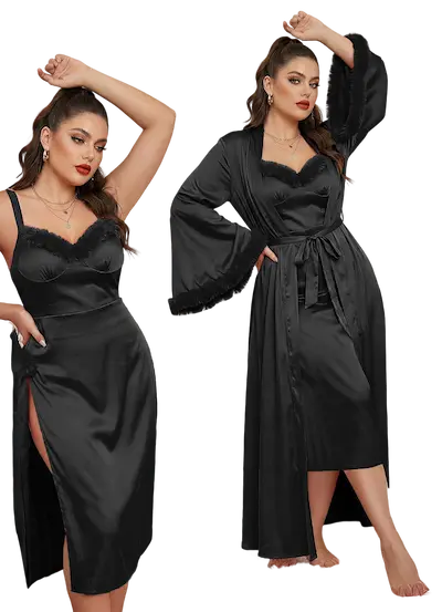 - الروب طويل بنفس خامة الساتان الفاخر ليكمل الاطلالة باسلوب ملكي انيق الاكمام واسعة ومزينة بحواف فرو ناعم يضيف فخامة واضحة للتصميم مع حزام ساتان لتحديد الخصر والتحكم في شكل الاغلاق سواء مفتوح لاطلالة جذابة او مغلق لمظهر اكثر هدوء
