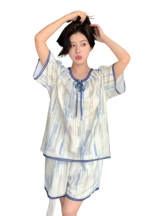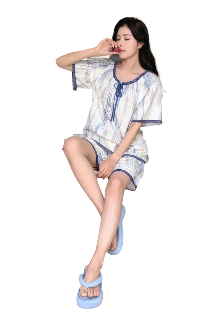 هوت شورت نسائي بنقشة عصرية أضيفي لمسة من الراحة والأناقة إلى خزانة ملابسك المنزلية مع هذا الهوت شورت الرائع يأتي بتصميم مريح وواسع مصنوع من خامة ناعمة وباردة مثالية لأيام الصيف، مع نقوش انسيابية تجمع بين الألوان الهادئة مثل الأزرق والبيج لإطلالة مميزة ومريحة خامة ناعمة وخفيفة مناسبة للبشرة الحساسة تصميم عصري بقصة واسعة لراحة مثالية تفاصيل دانتيل رقيقة على الأطراف لإطلالة أنثوية ناعمة مناسب للنوم أو للاسترخاء في المنزل اختاري الراحة بدون التنازل عن الأناقة