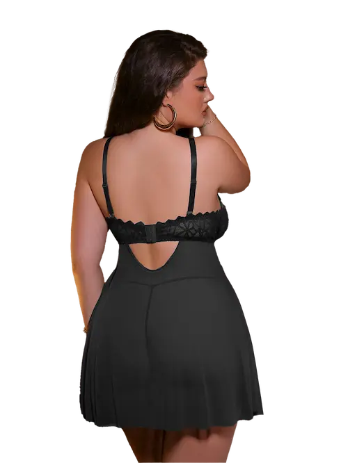- القصّة تبدأ من أسفل الصدر مباشرة بقصّة Empire waist تمنح تحديدًا خفيفًا وتُظهر الخصر بأناقة، الطول قصير يصل إلى منتصف الفخذ، مما يعطي مظهراً حيوياً ومغرياً دون مبالغة، تنتهي التنورة بحافة دقيقة ناعمة لضمان ملمس لطيف على البشرة ومظهر انسيابي جميل، الظهر يأتي الجزء العلوي عبارة عن شريط عريض من الدانتيل الأسود الشفاف يلف الظهر ويبرز التباين اللوني بشكل جذّاب، مزود بمشبك أنيق في منتصف الظهر على غرار حمالات الصدر لسهولة الارتداء والخلع، أسفل الشريط مباشرة توجد فتحة أنيقة تضيف لمسة مغرية دون مبالغة.