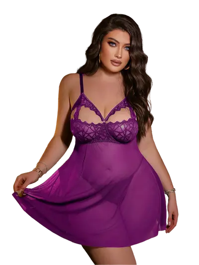 - لانجري قصير مصمم بالكامل من دانتيل شفاف مزخرف بنقشة ورود ناعمة تضيف أنوثة فائقة، يشبه التصميم شكل حمالة الصدر (برا) لتحديد الصدر بشكل طبيعي مع دعم خفيف ومظهر جذاب، يتميز بوجود فتحات صغيرة (Cut-outs) أعلى الكبّات تمنح لمسة جريئة دون أن تفقد الرقي، يزين المنتصف فيونكة صغيرة بلون موف غامق تضيف لمسة رقيقة،الحمالات رفيعة وناعمة، قابلة للتعديل لتناسب الطول المطلوب وتمنح راحة تامة أثناء الارتداء.