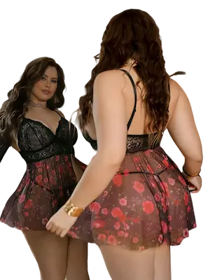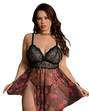 • الجزء السفلي مصنوع من خامة باورنت ليكرا شفاف خفيفة ومرنة، مزين بنقشة ورود حمراء على أرضية داكنة تعطي طابعا رومانسيا جذابا، وينسدل القماش بانسيابية من أسفل الصدر ليمنحك حركة ناعمة ومظهرا أكثر أنوثة