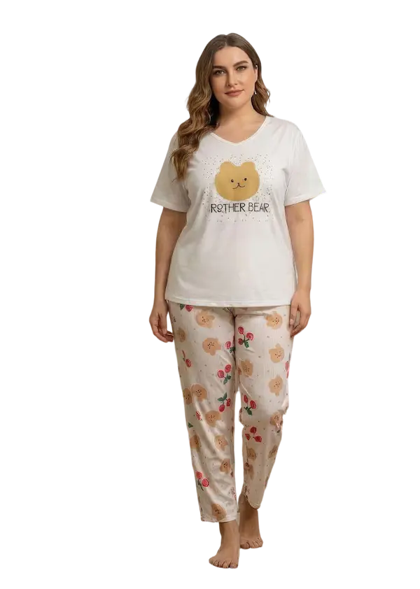 بجامة نص كم2026 موديل جديد بلون هادي أنيق، تي شيرت قطن ليكرا برسمة دب لطيفة برقبة V وأكمام نص كم مريحة، مع بنطلون ريب ليكرا مزين برسومات متناسقة بقصة واسعة ووسط مرن. تصميم مناسب للبيج سايز من 80 إلى 110 كيلو، عملي للبيت والنوم ويوفر راحة طوال اليوم. احجزي مقاسك الآن قبل نفاذ الكمية.