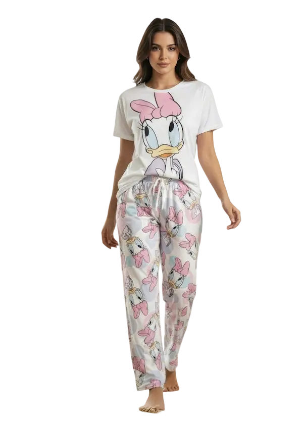 • في منتصف التيشيرت رسمة كبيرة لبطوطة الكرتونية مميزة بتفاصيل واضحة وألوان هادئة تميل للوردي ما يضيف طابع شبابي لطيف يخلي البجامة مختلفة ومبهجة في نفس الوقت الطباعة واضحة ومتناسقة مع لون البنطلون