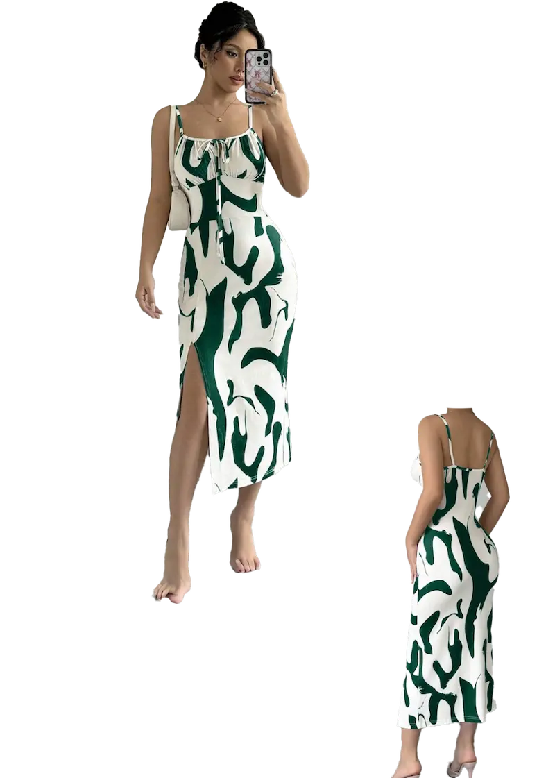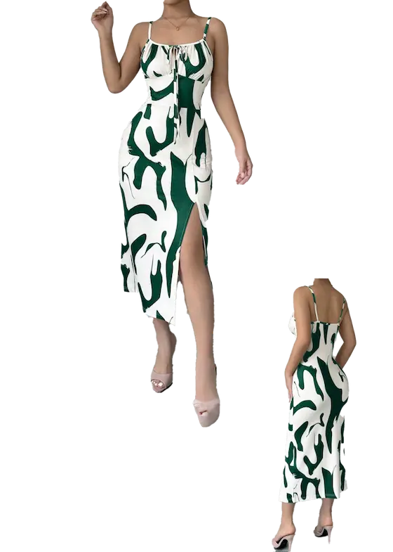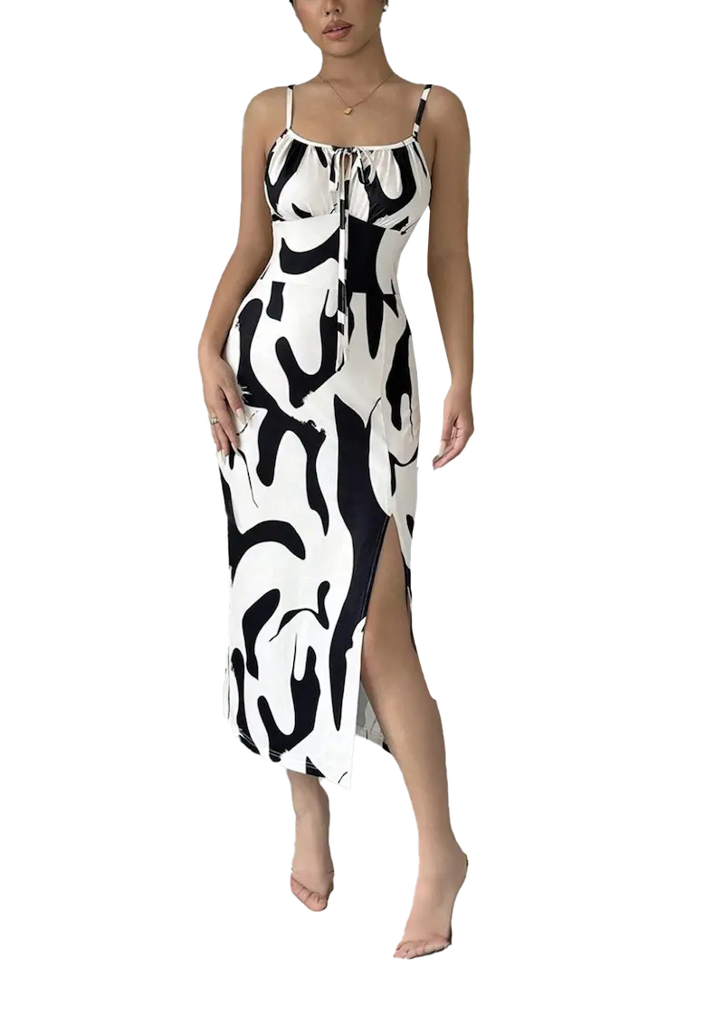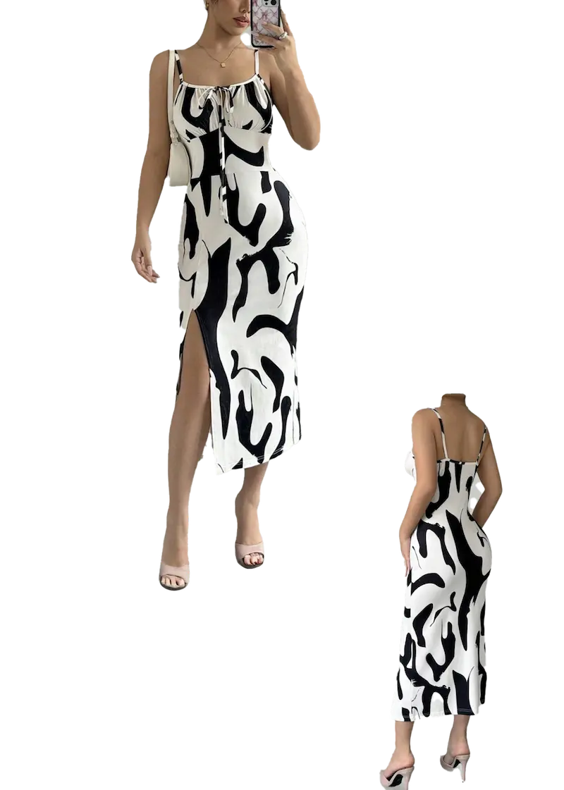 تألقي بإطلالة تخطف الأنظار مع فستان بلون الأبيض ولأسود الأنيق ولون الأبيض والزيتي الهادي، يتميز بتصميم حمالات رفيعة تكشف الأكتاف والصدر بشكل مغري طولة يصل إلي الركبة ومزود بفتحة من الجنب يمنحك مظهر راقٍ، مصنوع من خامة زبده ليكرا  فاخرة ليضفي لمسة من الجاذبية والفخامة إلي اطلالتك في كل وقت