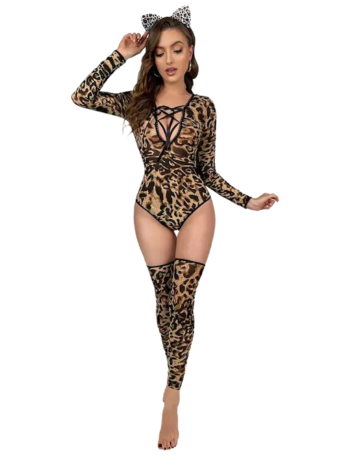 - القطعة الأساسية هي بادي سوت (Body Suit) بأكمام طويلة، مغطى بالكامل بنقشة التايجر/الفهد الجريئة التي تعكس القوة والجاذبية. يزداد التصميم إغراءً بفتحة صدر عميقة مُزينة بتفاصيل شريطية متقاطعة (Lace-up) تتيح لكِ تعديل الإغلاق حسب الرغبة. ي