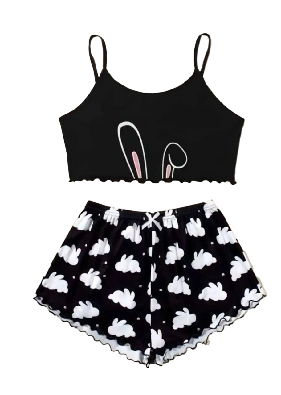 • توب كب بحمالات رفيعة، بقصة أنيقة بتبرز جمال القوام، مع رسمة أذن الأرنب اللطيفة اللي تضيف روح مرحة للموديل.