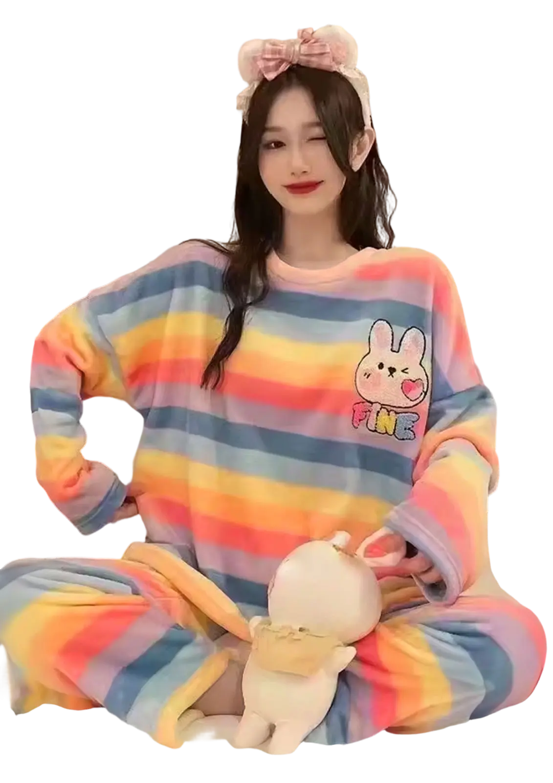 دلعي نفسك براحة لا تقاوم مع بيجاما قطعة صنعت لتجمع بين الدفا، النعومة، والألوان المبهجة اللي تملأ يومك طاقة وحيوية مصنوعة من خامة قطيفة الفاخرة وناعمة جدا على البشرة، تمنحك إحساس دافئ وملمس مخملي مريح، مثالية لأيام البرد الطويلة والليالي الشتوية تصميمها العصري بألوان قوس قزح المبهجة ورسمة الأرنب الكيوت المطرزة على الصدر يضفوا لمسة مرحة وأنثوية، مع قصة واسعة ومريحة تناسب كل القوام وتمنح حرية حركة مثالية.