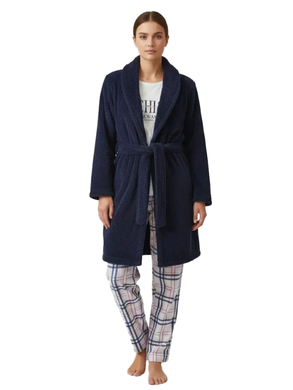 السعر: 445 جنيهبجامة شتوي حريمي 2026 طقم قطعتين سمبل وناعم للبيت، معمول علشان يديكي دفا وراحة مع شكل رقيق ومرتب طول اليوم، البلوزة لون كحلي أنيق برقبة دائرية بسيطة وأكمام طويلة تديكي إحساس دافي ومريح، وعلى الصدر كتابة شتوية لطيفة تضيف لمسة أنوثة هادية وتخلي الإطلالة شيك من غير أي مبالغة، البنطلون كاروهات بينك رقيق بقصة مستقيمة مريحة ووسط مطاط يثبت من غير ضغط ويسمح بحرية الحركة في القعدة والمشي، الطقم مناسب للبيت واللمة والزيارات الخفيفة، وكمان ينفع هدية لطيفة للعرايس وللمناسبات لأن شكله ناعم وخامته شتوية دافية، تقدري تلبسي كل قطعة لوحدها وتطلعي بأكتر من لوك، خامة عملية وسهلة في الاستخدام اليومي